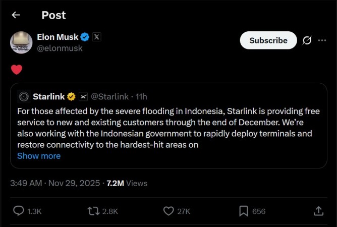 Elon Musk Gratiskan Layanan Starlink untuk Pelanggan Terdampak Banjir di Sumatra - Image Caption